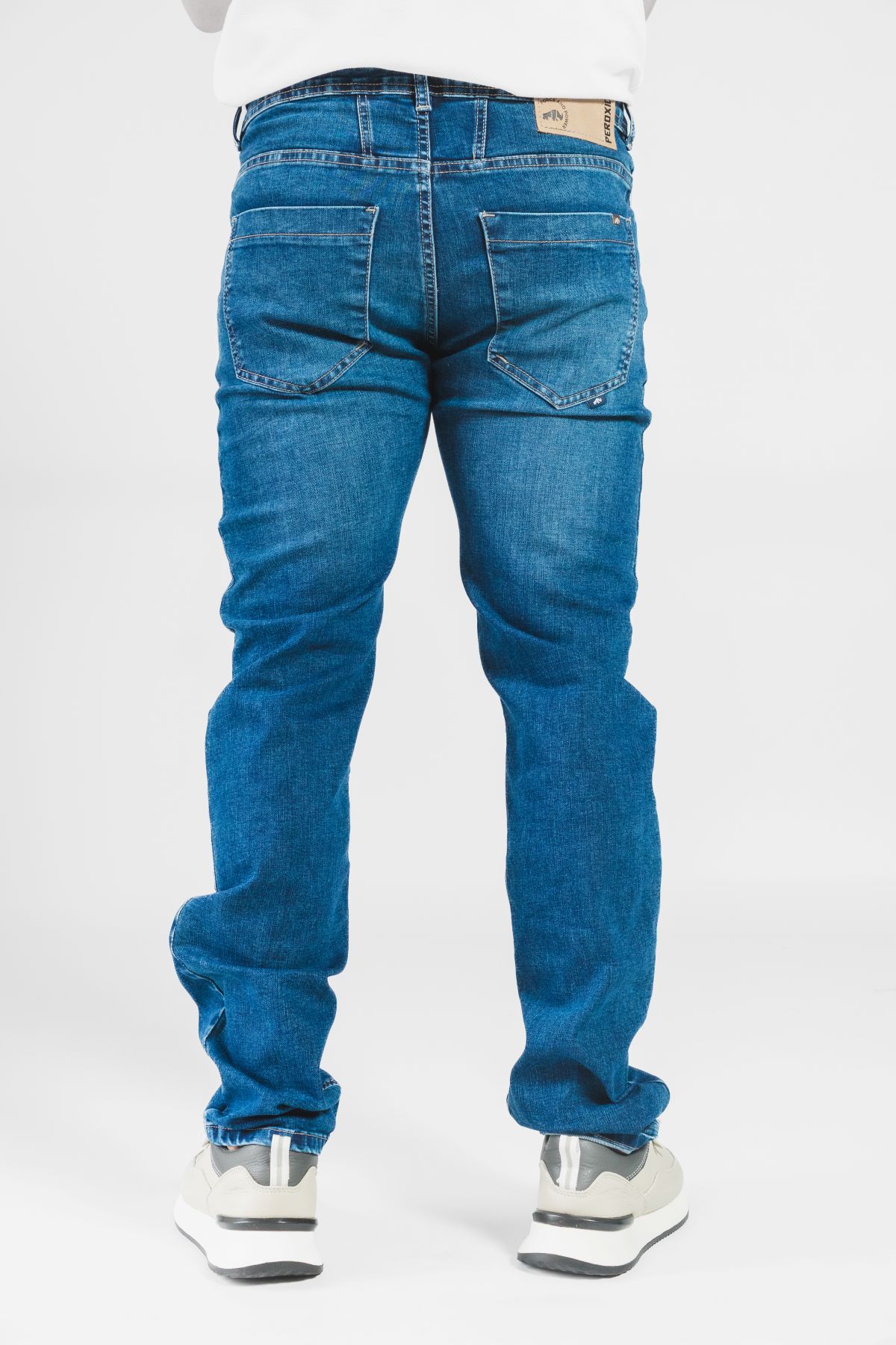 Jean 5 bolsillos funcionales en tono medio con pretina tradicional y bota fit, diseñado para un ajuste cómodo y moderno.